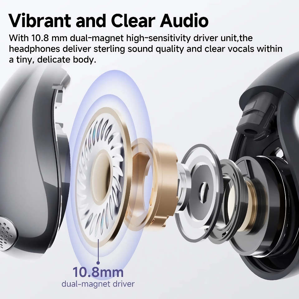 What sets our Bluetooth earphones apart is their combination of modern technology and user-friendly design. The open-ear feature provides a new way to listen to your favorite audio while remaining aware of your environment. With advanced Bluetooth 5.4 technology, you get a strong and reliable connection, minimizing interruptions during use. Plus, the stylish design ensures you look good while you enjoy your favorite tunes.